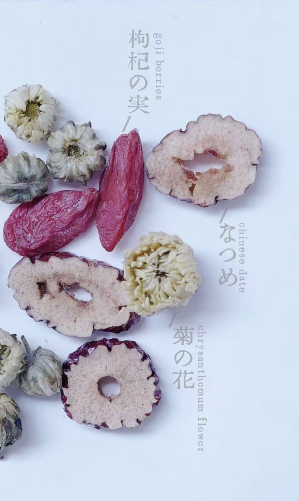 原材料名: 胎菊(菊花)、乾燥なつめチップス、クコの実